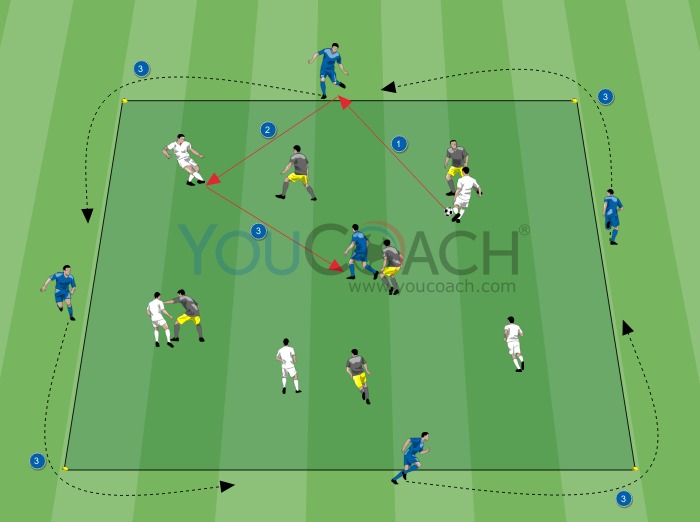 - Se os jogadores em inferioridade recuperarem a bola, devem tentar tirá-la do quadrado com a cooperação do curinga interno, e todos os outros jogadores devem tentar impedir isso criando pressão sobre o portador da bola e fechando possíveis linhas de passe