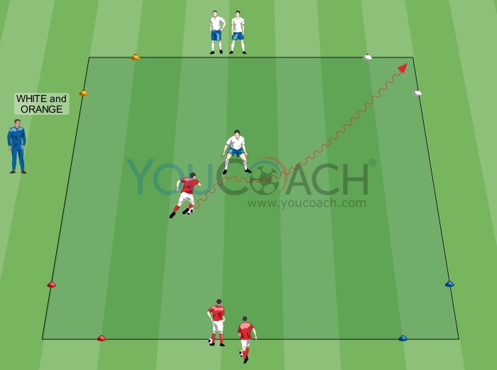 - À medida que os dois jogadores entram no quadrado, o treinador chama duas cores relacionadas com duas balizas (branco e laranja na imagem)