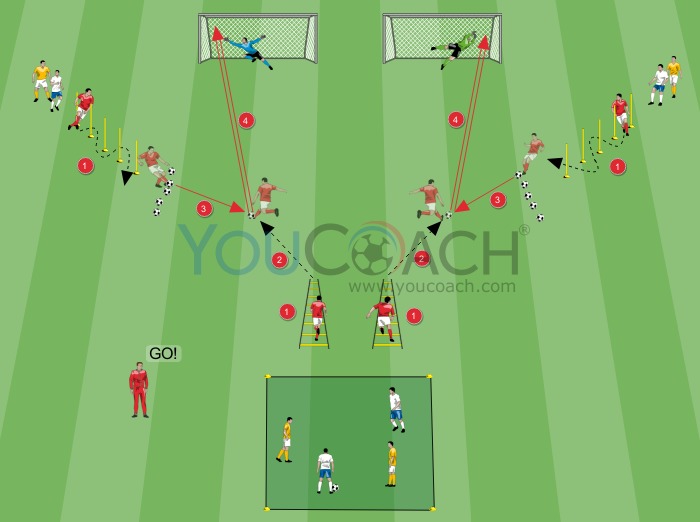 - Ao sinal do treinador ("GO" na imagem), a dupla de jogadores dentro do quadrado, correspondente à primeira dupla a começar nos percursos (dupla de jogadores vermelhos na imagem), sai para enfrentar as escadas de agilidade, enquanto a dupla superior sai para fazer slalom sobre o percurso de 5 postes. Ao sair do percurso de slalom, os dois jogadores vermelhos passam a bola para os dois colegas de equipa vermelhos que saem das escadas de agilidade