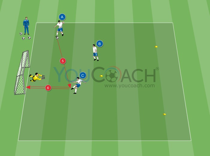 Dentro da área fixa (30x20 metros), coloque 3 marcadores para formar um triângulo isósceles com lados de 10 metros de comprimento. Coloque o gol a 15 metros do vértice. Os jogadores A, B e C permanecem perto dos 3 marcadores, os outros jogadores permanecem fora do campo esperando a vez. O goleiro permanece na linha do gol. O jogador A começa com a bola.