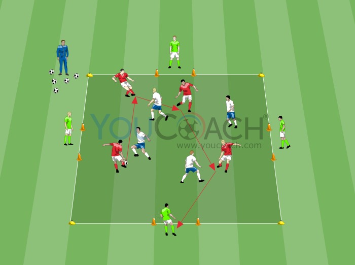 Forme um quadrado de 20x20 metros usando os marcadores. Crie 4 balizas com 2 metros de largura no meio de cada lado do quadrado usando os cones (como mostrado na figura). Divida os jogadores em 3 equipas (4 vermelhos, 4 brancos e 4 verdes). Na figura, os jogadores com os coletes verdes ficam um ao lado de cada pequena baliza, enquanto os jogadores vermelhos e brancos iniciam o exercício dentro do quadrado. O treinador tem a bola.