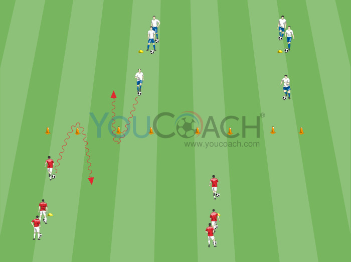 - Perto dos cones, os jogadores devem aumentar o número de toques na bola para melhorar a técnica de virada controlada