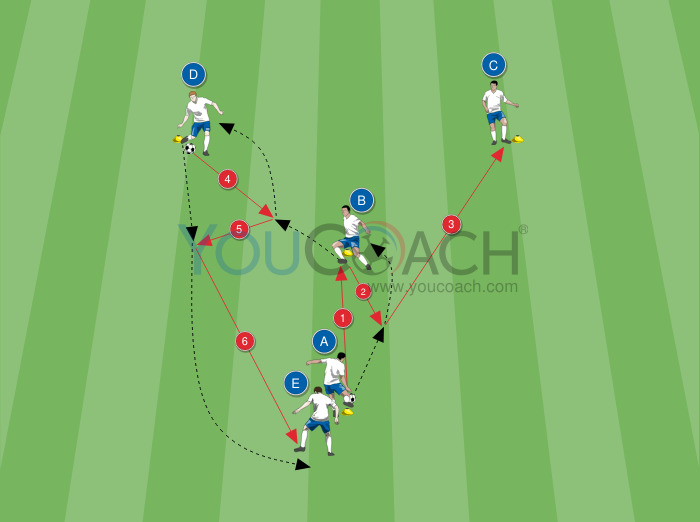 - O jogador D passa a bola para o jogador E e segue o passe, indo para trás dele (jogador E), que recomeça o exercício da mesma forma