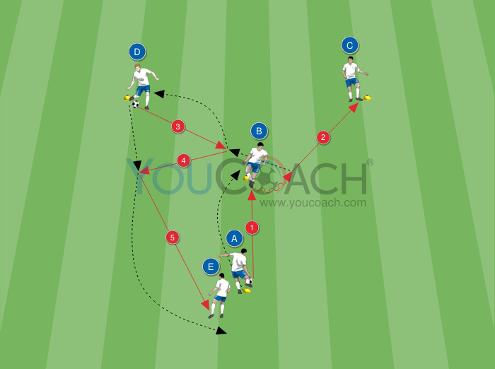 - O jogador D passa a bola para o jogador E e depois segue o passe indo para trás dele (jogador E) que recomeça o exercício da mesma forma