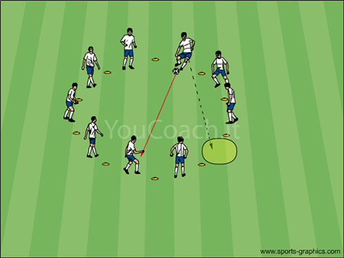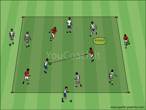 Exercício utilizado pela academia do Barcellona para introduzir: perceção do espaço, ativação de uma reação a eventos e visão periférica. |