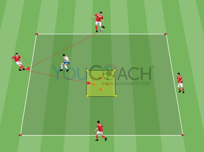 Faça um quadrado de 10x10 metros usando 4 marcadores. Em cada lado do quadrado, coloque um jogador, fora dele. No centro da área, faça um quadrado de 3x3 metros com 4 marcadores. Dentro do pequeno quadrado, coloque 4 cones (Veja a imagem). Um jogador fica fora do pequeno quadrado e o defende. Dê uma bola a um dos jogadores externos, aqueles que estão fora do grande quadrado. Faça a quantidade adequada de áreas de jogo para que toda a equipe possa participar do exercício.