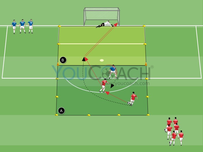 - Em pares, os atacantes iniciam o jogo com a bola na área de jogo A e devem tentar concluir a jogada no tempo