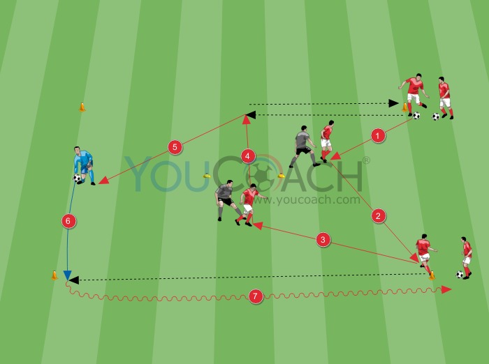 - O jogador ao lado do cone passa a bola para o segundo jogador ao lado do marcador, seguido por uma pressão passiva do defensor, que entretanto se moveu lateralmente para receber a bola