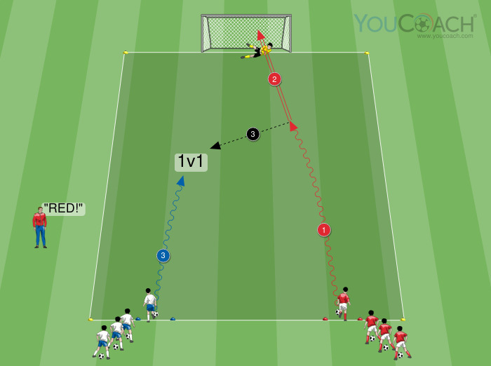 1v1 - Prática para condução de bola rápida e remate à baliza com situação de 1 contra 1 (ataque e defesa) -