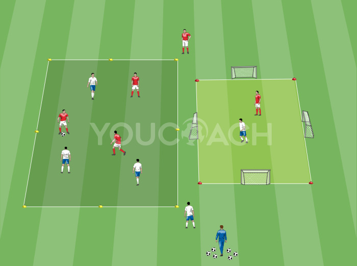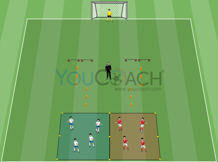 Receção - Exercício situacional com slalom, 1 contra 1 e finalização à baliza
