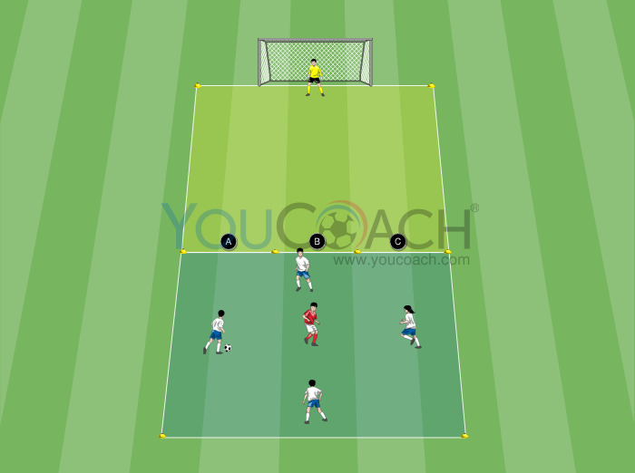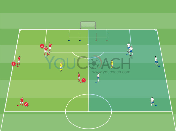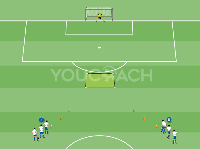 Passe - Sequências de passes de quatro jogadores com triangulações e situação final de 1 contra 1 com remate de precisão ou condução de bola -