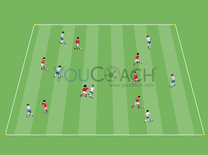 Condução da bola - Exercício que treina o drible em situações onde os jogadores têm espaço limitado disponível -