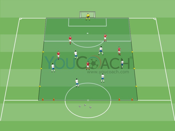 Posse de bola - Jogo de posse de bola com 4 áreas diferentes para chutar, útil para treinar vários aspectos táticos, como procurar um espaço, mudança de jogo, desmarcação e, em seguida, alguns aspectos técnicos, como chutes, bolas alçadas e cabeceios -