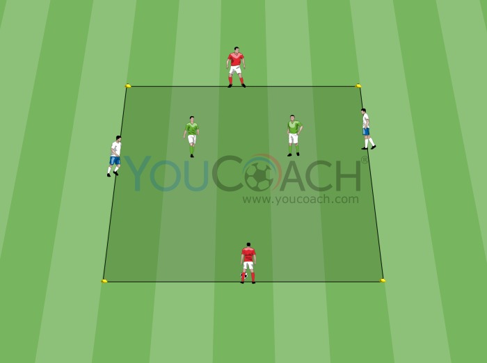 Mudança de flanco - Jogo reduzido 7 vs 7 + 2 jogadores neutros, útil para treinar o passe cruzado, mudando o jogo e as transições de um lado para o outro -