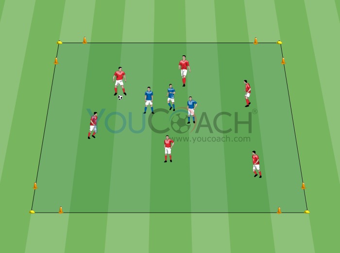 Transição - Jogo simplificado de posse de bola, 5 contra 3 para trabalhar a transição positiva -