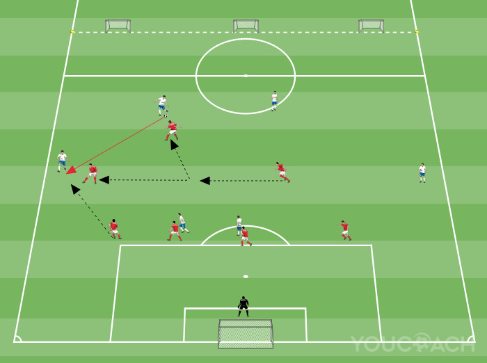 Dobra de marcação - Exercício situacional para treinar os meio-campistas a procurar a dobradinha vertical -