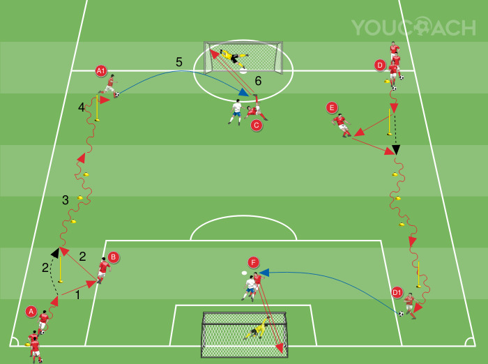 Circuito técnico: um-dois, zigue-zague, drible e cruzamento