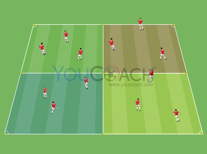 Transição - Exercícios progressivos em um quadrado de 30x30 metros dividido em zonas -
