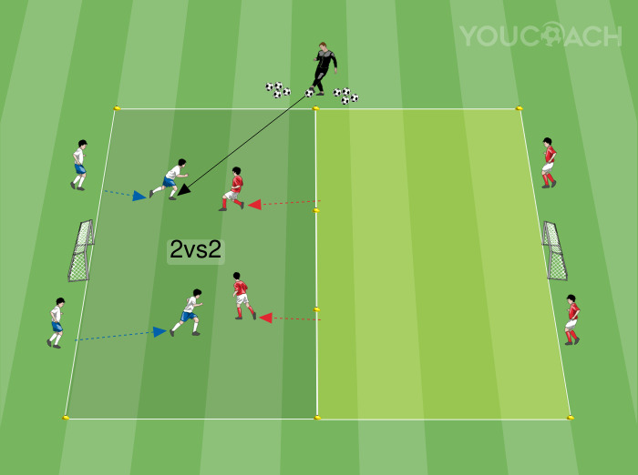 2v2 - Situação de jogo 2 vs 2 com pressão alta dos defensores para recuperação da bola -